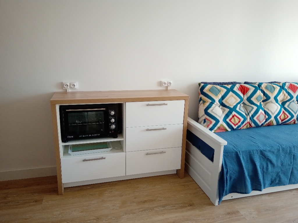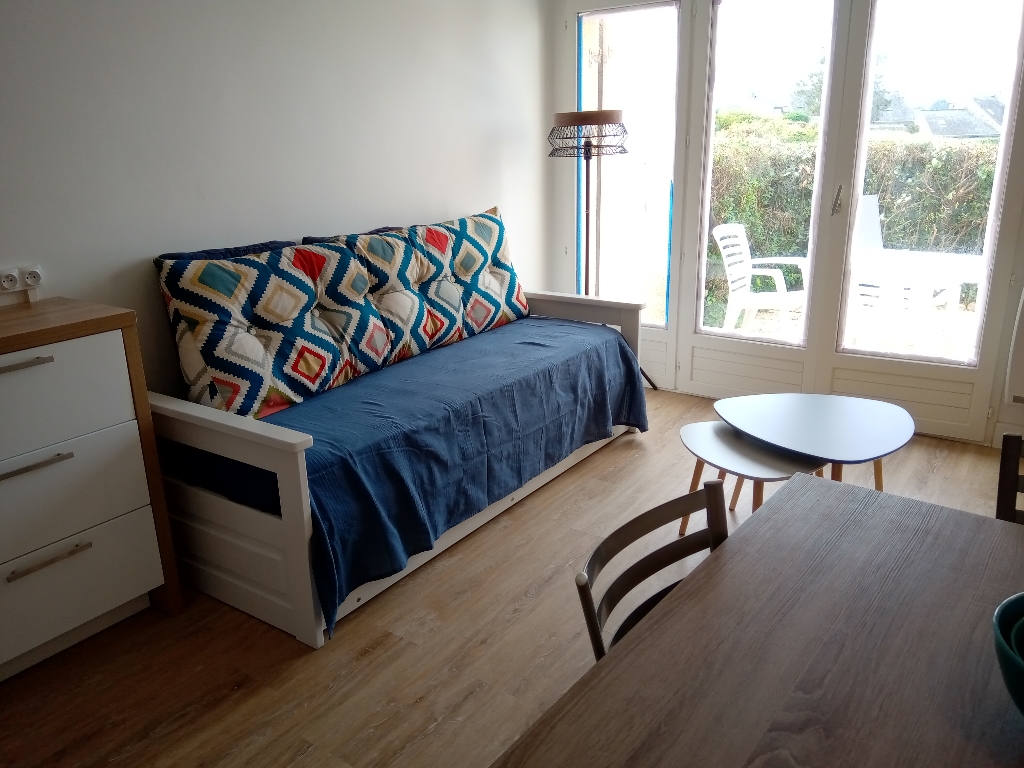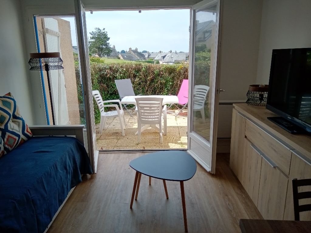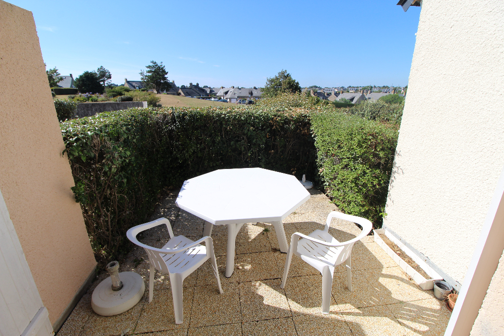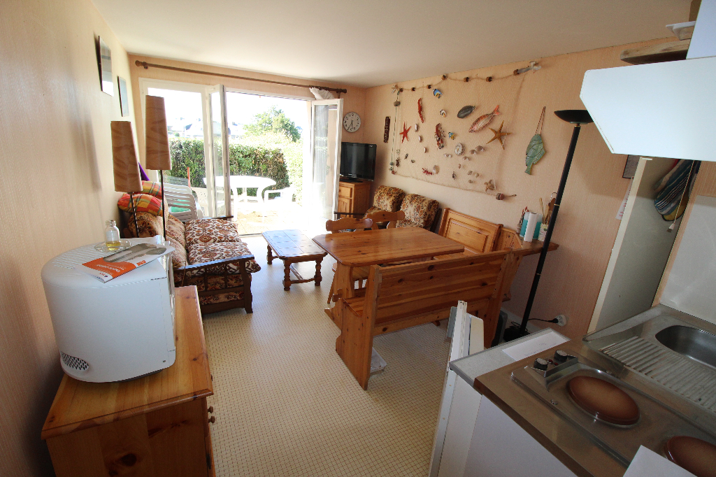 PORT CROUESTY – appartement de type 2 comprenant : séjour-salon avec coin cuisine équipé avec l’ensemble des éléments de rangement et électroménager, salle de bains avec w.c, une chambre. Terrasse. Garage en sous-sol de 14 m². Très belle opportunité. A rafraichir.