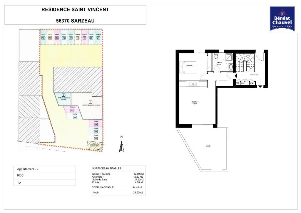 SARZEAU CENTRE. Dans une résidence à taille humaine composée d’un bâtiment sur 3 niveaux offrant 5 appartements: Au rez-de-chaussée du bâtiment un appartement de type 2 pièces de 44 m² env. comprenant entrée avec placard, séjour/cuisine exposé SUD, 1 chambre avec placard, salle d’eau avec WC. Jouissance privative d’un jardin de 23 m² env. Prestations de qualité. Possibilité cave et stationnement en sus. Vendu achevé.