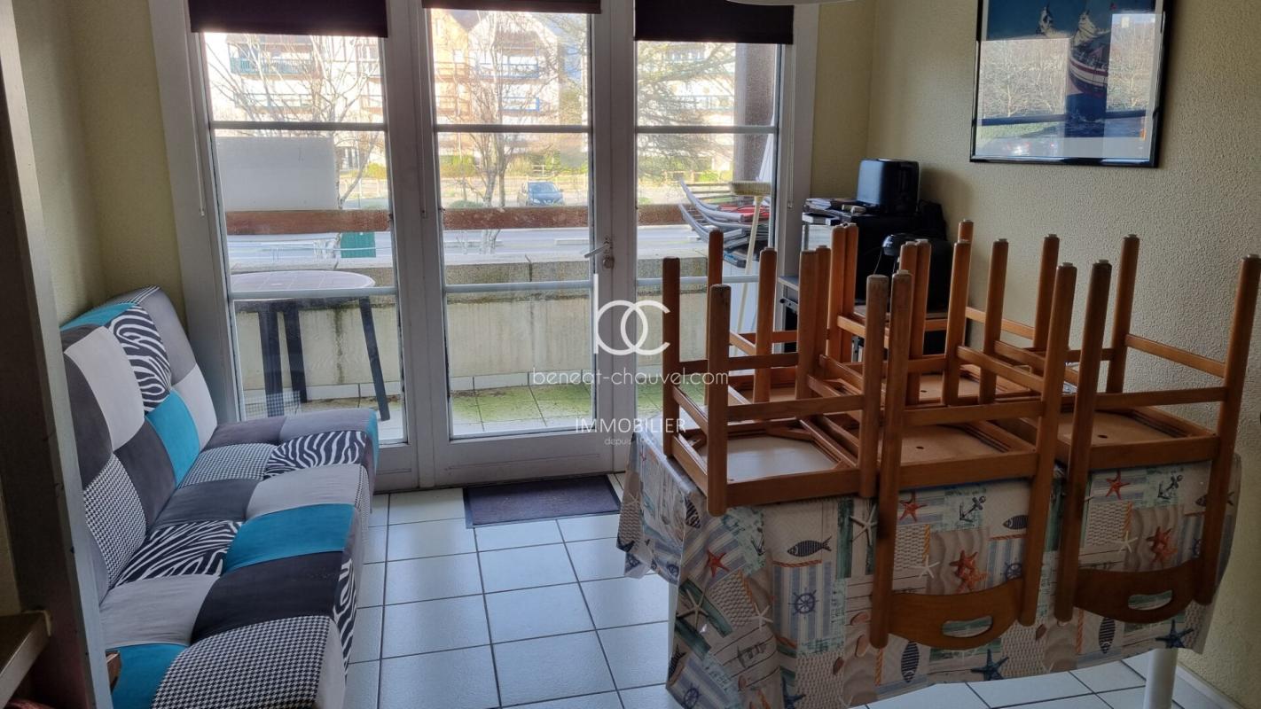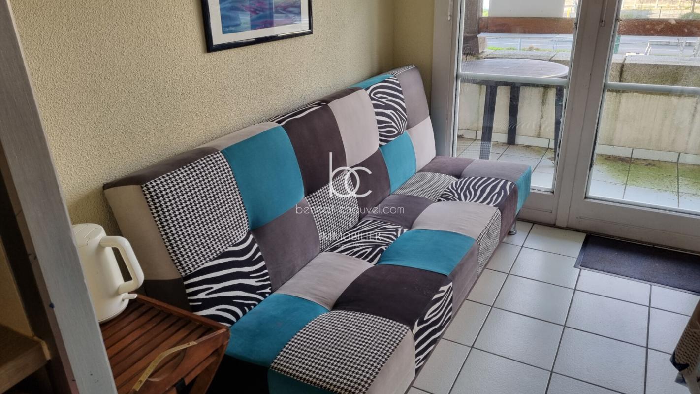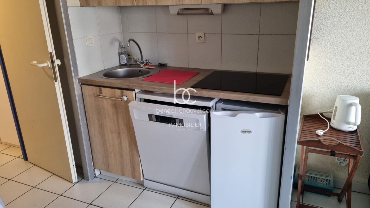 Entrée (coin-nuit – 2 lits superposés) – Séjour (canapé-lit) donnant sur balcon – cuisine américaine équipée et aménagée (plaque de cuisson ; petit réfrigérateur ; lave-vaisselle) –