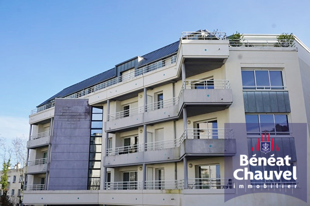 Vannes, au pied du centre et des commerces, dans résidence de grand standing, magnifique 3 pièces comprenant : hall avec placards, séjour-salon et cuisine équipée sur terrasse sud ouest, 2 chambres dont une sur terrasse, salle de bains, wc.