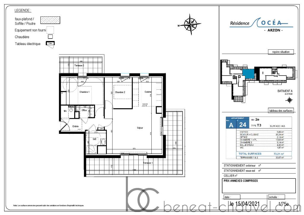 Emplacement et environnement de 1er choix à 200 m centre bourg et Port Crouesty pour cette résidence de 41 logements avec ascenseur, au 2ème et dernier étage, bel appartement de type 3 comprenant entrée, séjour, coin cuisine, 2 chambres dont une avec placard, salle d’eau et WC indépendant.