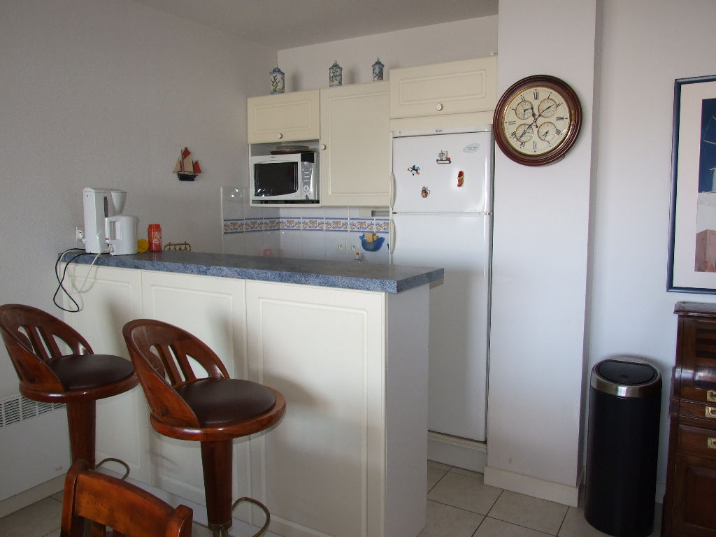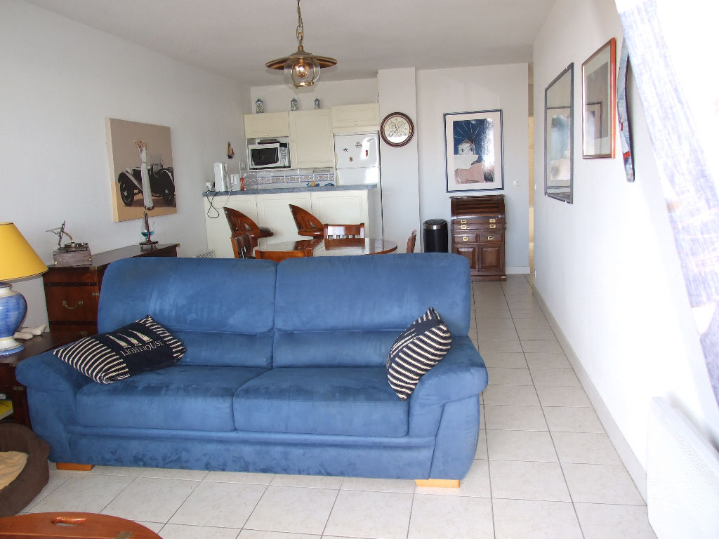 Port du Crouesty, vue sur le port, dans résidence sécurisée appartement T3 vendu avec des meubles marins de qualité comprenant : entrée, séjour avec coin cuisine aménagé et équipé, deux chambres donnant sur un jardin, salle de bains, W.C. Terrasse semi couverte d’environ 18 m². Parking privatif. Belles prestations. Domotique. Possibilité d’acquérir un garage souterrain en sus.