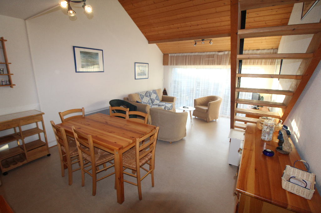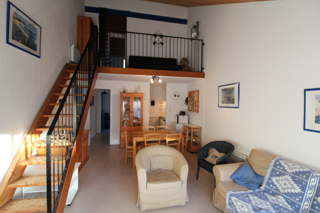 Accès direct plage du fogéo, idéal pour vos vacances, appartement 3 pièces duplex avec belle hauteur sous plafond comprenant entrée, séjour salon avec coin cuisine équipé, chambre, wc. A l’étage mezzanine, chambre, salle de bains. Une cave en sous sol.
