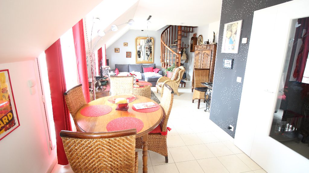En plein coeur du centre ville de Sarzeau, commerces à pied pour cet agréable appartement en duplex situé au 3ieme et dernier étage avec ascenseur comprenant une entrée avec placard et wc, pièce de vie lumineuse donnant sur une grande terrasse de 26m², une cuisine ouverte aménagée et équipée, une chambre avec sa salle d’eau, à l’ètage une chambre cabine avec sa salle d’eau avec wc;