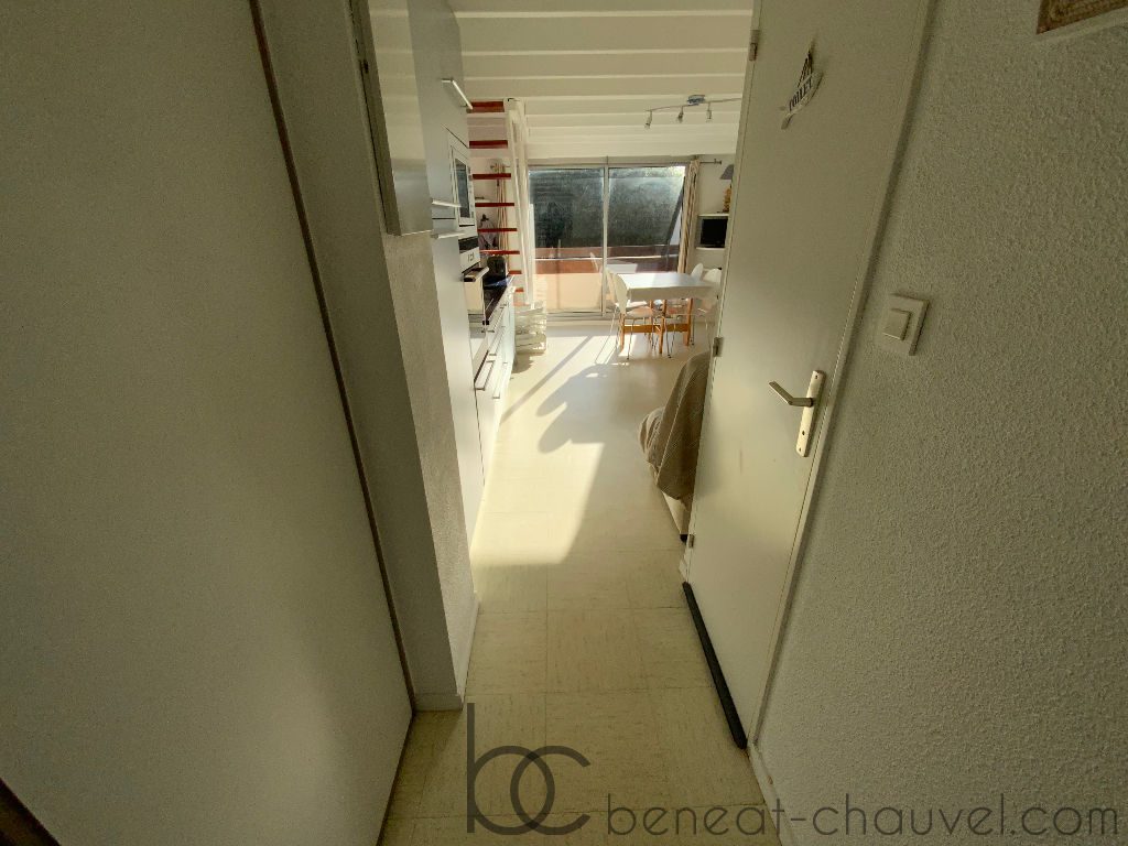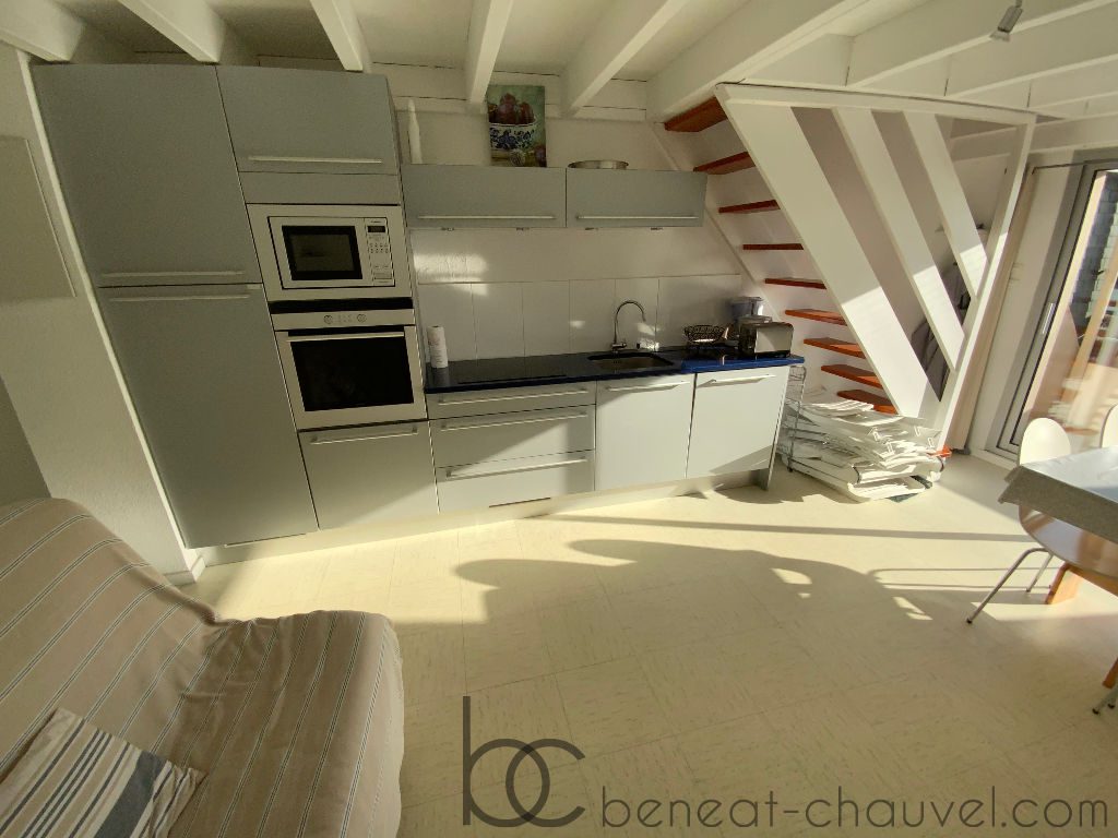 Agréable appartement en duplex à deux pas du port et des plages, comprenant entrée avec placard, wc, salle d’eau, séjour avec cuisine équipée et aménagée donnant sur un balcon orientée plein Sud, à l’étage deux chambres, place de parking privative et local à vélo.
