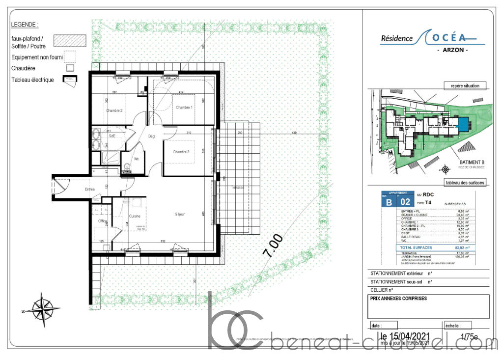 Emplacement et environnement de 1er choix à 200 m centre bourg et Port Crouesty pour cette résidence de 41 logements avec ascenseur, au rez de chaussée, bel appartement de type 4 comprenant entrée avec placard, séjour, coin cuisine, office, 3 chambres dont une avec placard, dégagement, salle d’eau et WC indépendant.