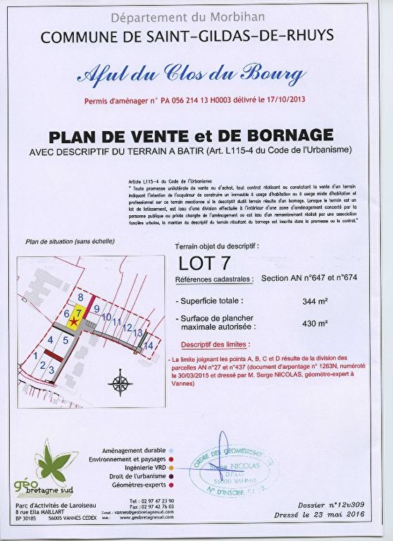 EXCLUSIVITÉ, au centre bourg de Saint Gildas de Rhuys, Proche de l’abbatiale et des commerces, beau terrain à bâtir viabilisé. Coefficient d’emprise au sol autorisée : 60 % et 430 m² maximum de surface de plancher.
