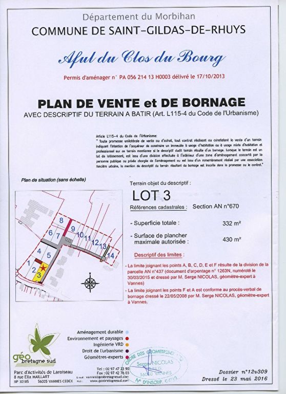 EXCLUSIVITÉ, au centre bourg de Saint Gildas de Rhuys, Proche de l’abbatiale et des commerces, beau terrain à bâtir viabilisé. Coefficient d’emprise au sol autorisée : 60 % et 430 m² maximum de surface de plancher.